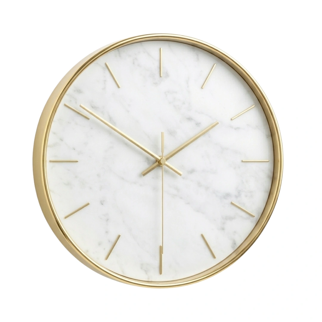 Devar Modern Minimalist Carrara Marble Wall Clock – Round Gold Rim & Indices